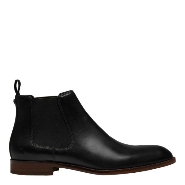 Chelsea black leather boots with an almond toe, elastic side gussets, and back pull tab – slipping into them is effortlessly smooth. The lightweight, natural-colored resin rubber sole ensures comfort without compromising on style.