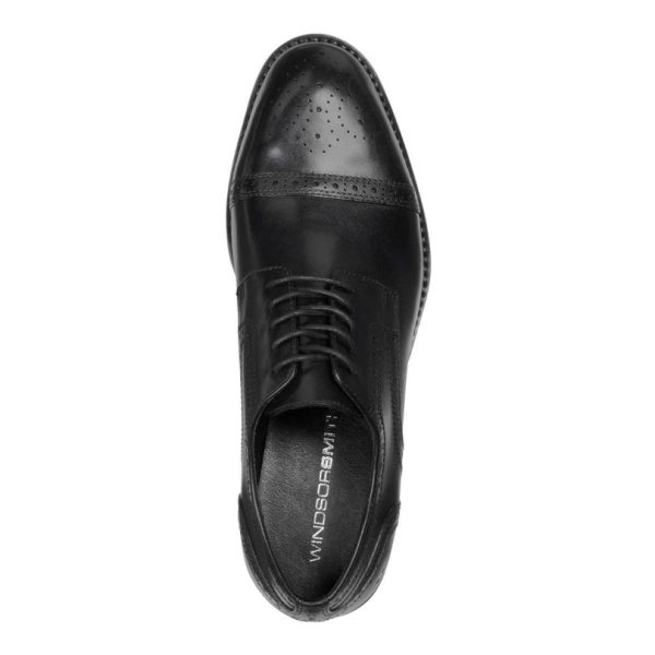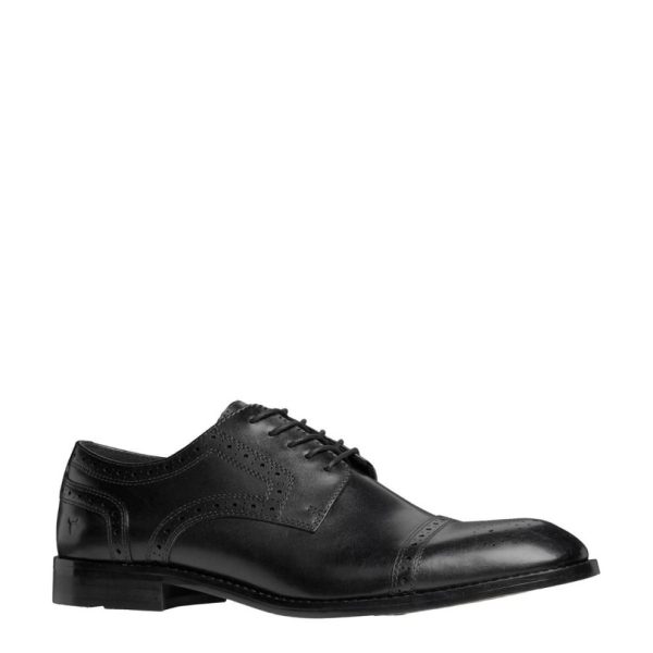 These black dress, derby style shoes showcases exquisite brogue and toe cap detailing. The five-eyelet facing and almond toe contribute to its refined silhouette. Handmade with precision, the resin and rubber sole features an extended welt for both durability and elegance. Each pair is meticulously finished and stained by hand.