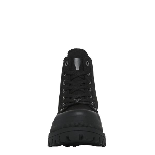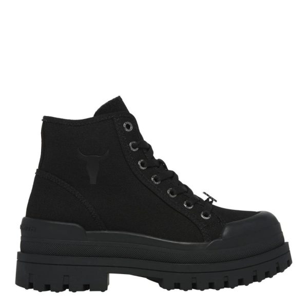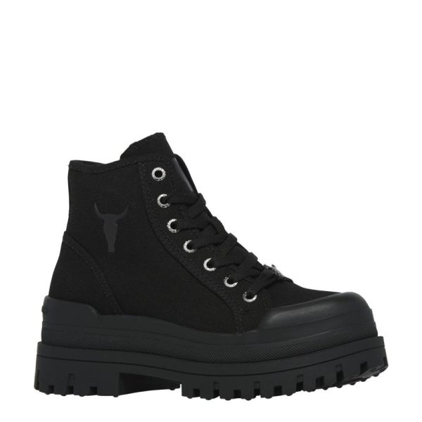 Experience rugged style with Windsorsmith’s Deserve canvas hiking-style platform boots. These boots feature a cleated sole for stability and a durable canvas upper for versatility.