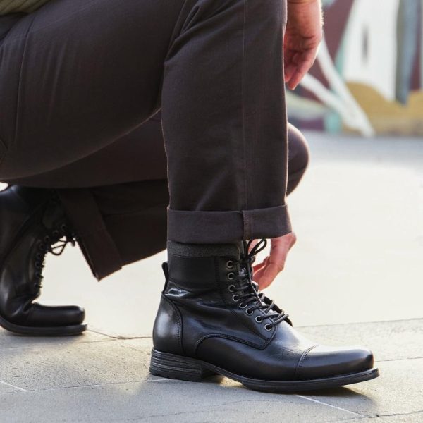 Feverr, our essential men’s black lace-up boots. With a sturdy construction and cleated sole, these casual men’s boots are both durable and reliable. Featuring a toe cap, padded topline collar, and inside zip for easy entry. They offer both style and comfort for everyday wear.