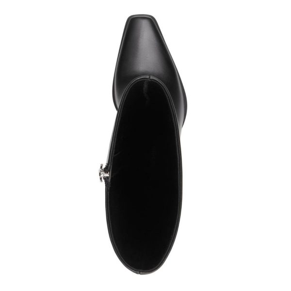 Hierarchy women’s knee-high boots. These black boots feature a high stiletto heel, with a chisel toe shape. The inside zip ensures easy entry, while the extended welt on the sole forepart adds a touch of uniqueness to the design.